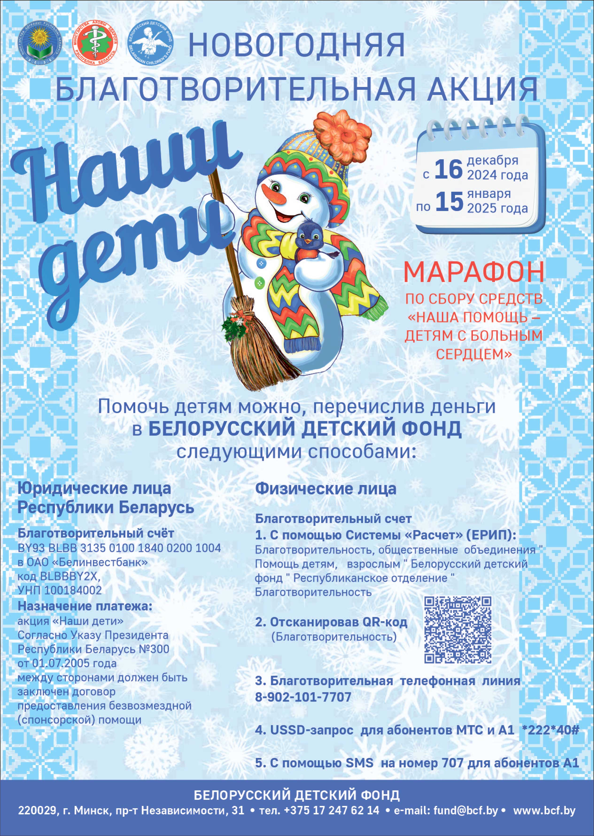 В период с 16 декабря 2024 г. по 15 января 2025 г. в Республике Беларусь проходит новогодняя благотворительная акция «Наши дети», в рамках которой РОО «Белорусский детский фонд» проводит марафон по сбору средств для оказания помощи детям с заболеваниями сердца.
